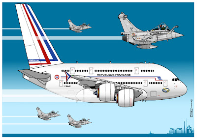 Vue personnelle d'un "France One" au top de la technologie et du confort : appareil de haut standing plus chasseur de dernière génération comme pack défensif, y'a pas à dire:" c'est du lourd!". Dans une carrière de pilote, il faut des fois, endosser le rôle de garde républicain...